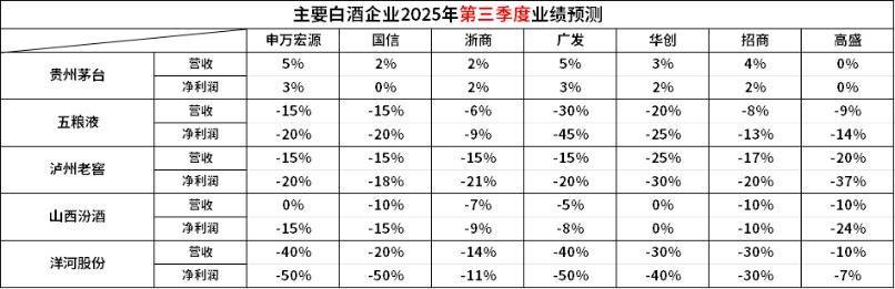 华创预测头部白酒Q3业绩情况如下:茅台预计Q3收入/利润同增3%/2%;五粮液预计收入/利润下滑20%/25%;泸州预计收入/利润同降25%/30%;山西汾 酒预计收入/利润同比持平;洋河股份预计收入/利润同降30%/40%。